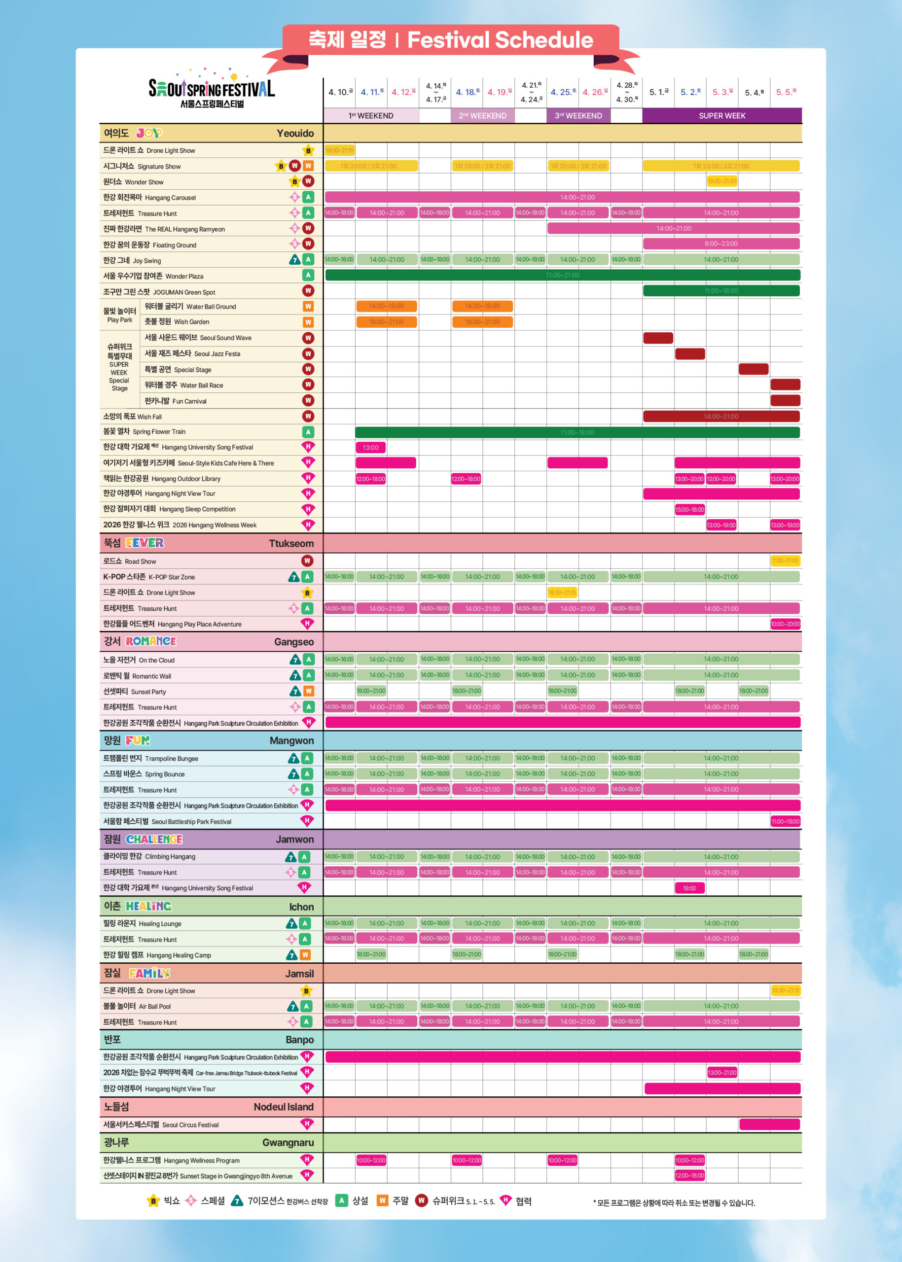 홈festival 서울스프링페스티벌 2026 트레저헌트 참여방법 bystitch • • 2 min read 서울스프링페스티벌 2026 트레저헌트 참여방법 트레저헌트는 한강 7개 선착장을 이동하며 미션을 수행하는 참여형 프로그램입니다. 행사 전체 일정표 보기 장소 여의도 뚝섬 마곡 망원 압구정 옥수 잠실 운영 시간 평일 14:00 ~ 18:00 주말 14:00 ~ 21:00 참여 방법 지도 수령 미션 수행 스티커 획득 리워드 교환 리워드 3개 완료 기념품 5개 완료 추가 혜택 7개 완료 특별 리워드 Tags: festival 4.94 / 169 rates 전달 복사Link Copied 공유 별점